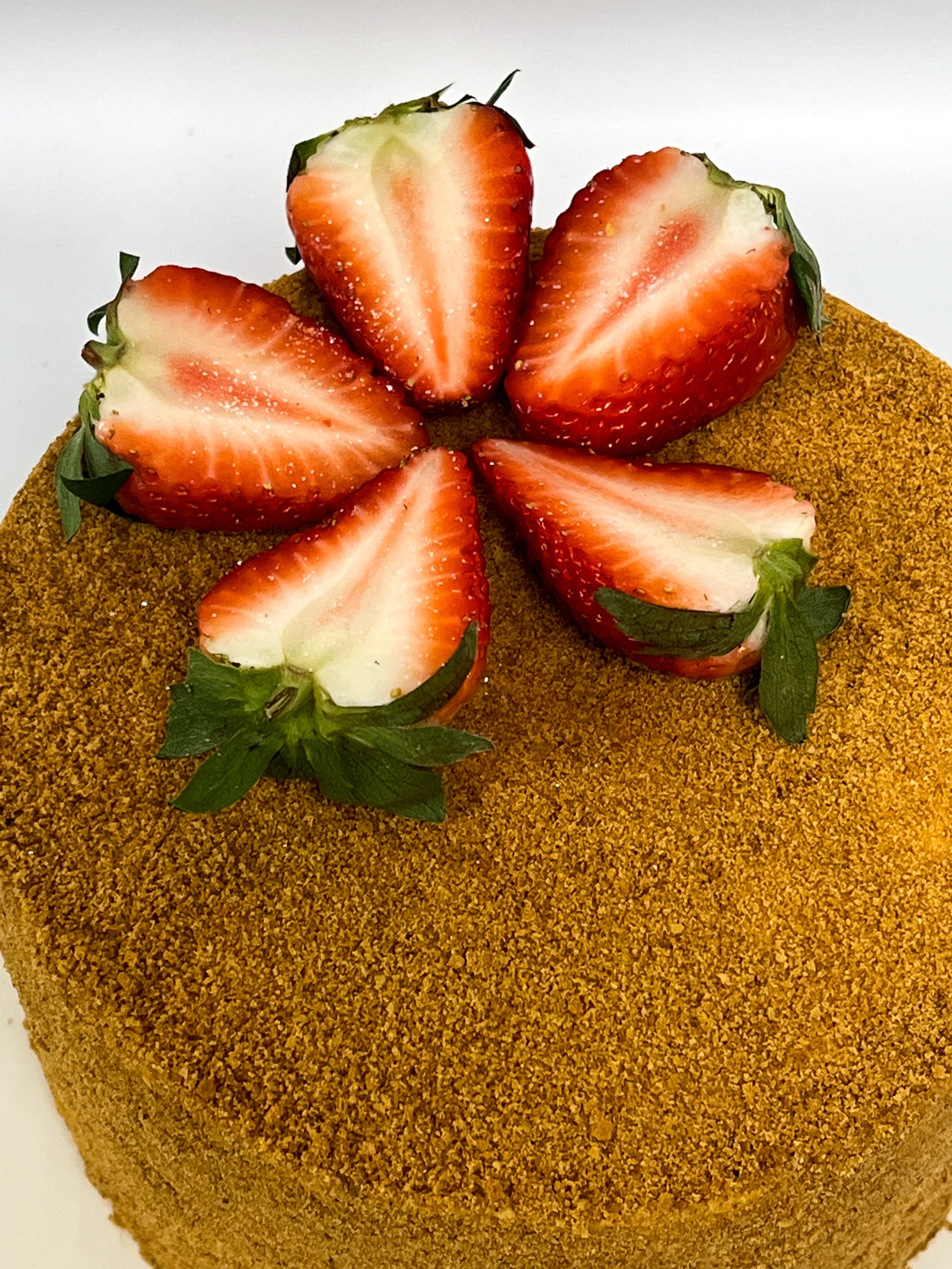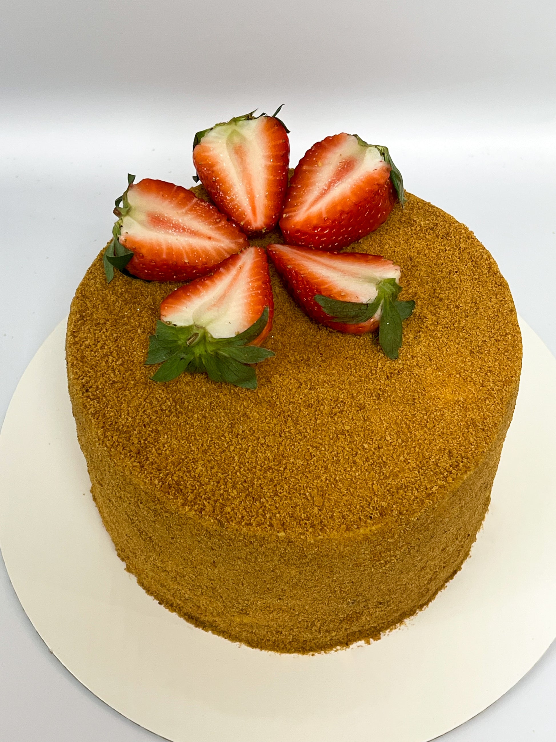 Delicate, ultra-soft honey cake layers paired with a light whipped cream based filling. Perfectly balanced, not too sweet.
